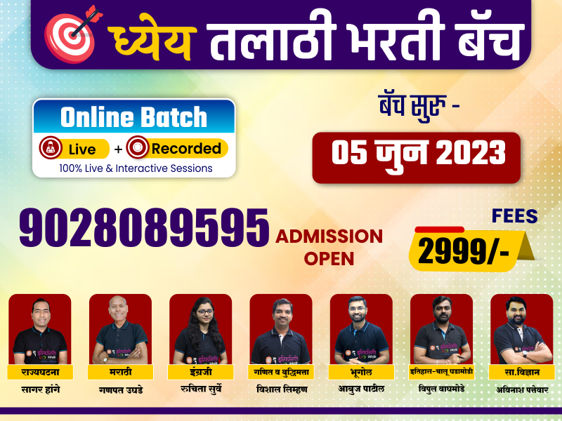 लक्ष तलाठी बॅच 2023 परिपूर्ण ONLINE बॅच batch विषय समाविष्ट : 1. मराठी 2. इंग्रजी 3. अंकगणित व बुद्धिमत्ता 4. सामान्य अध्ययन 🔗. लेक्चरच्या माहितीसाठी टेलिग्राम जॉईन करा : - https://t.me/theinfinityacademy अधिक माहिती साठी संपर्क: 9028089595